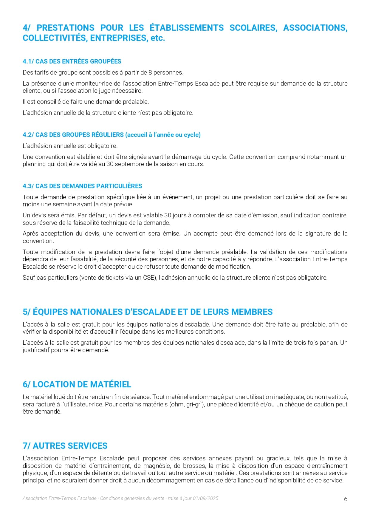 Dans le cas où un moniteur extérieur au club souhaite encadrer l’escalade dans la salle, il doit impérativement en demander l’autorisation à la Direction qui en définira les conditions.