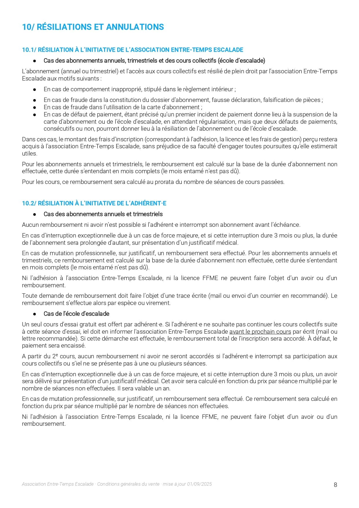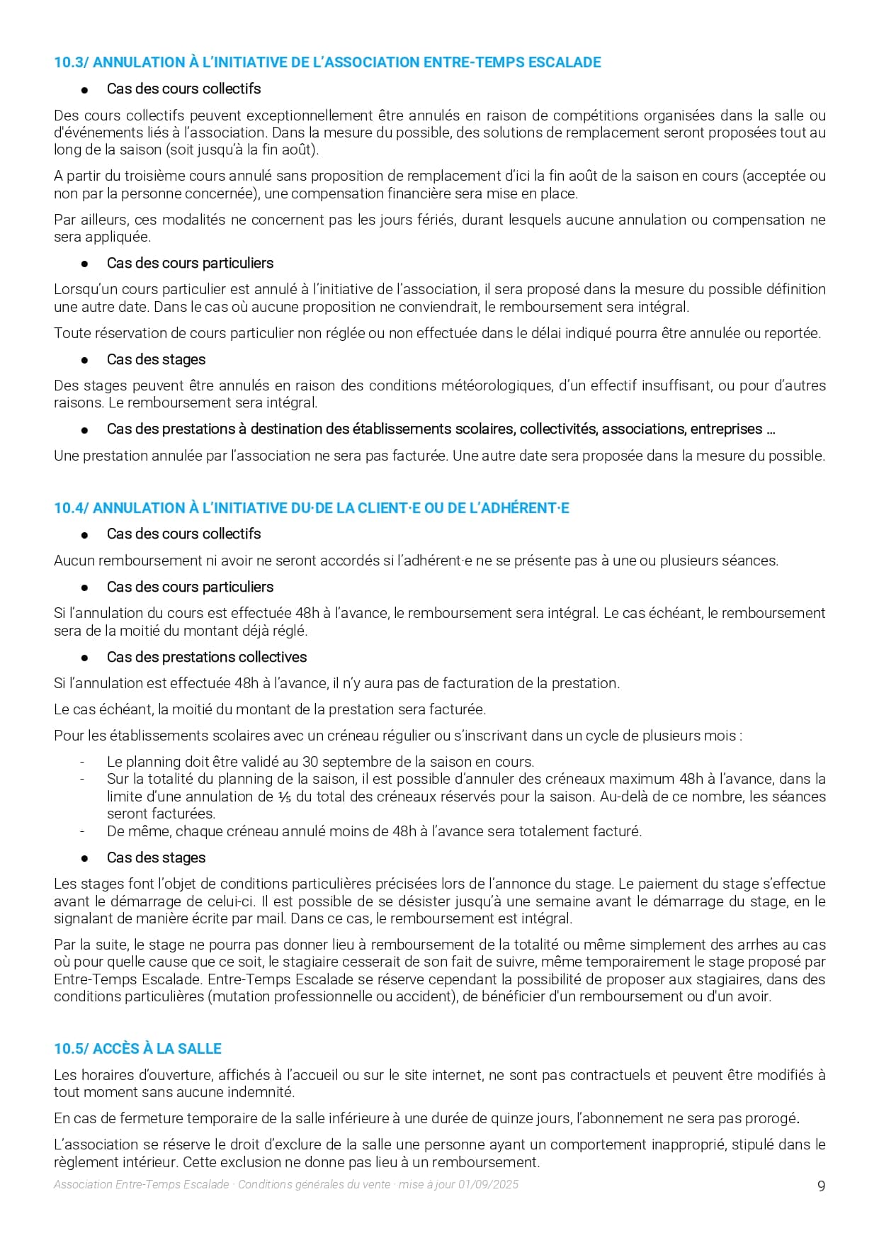 Le personnel de la salle se réserve le droit d’exclure, sans préavis ni indemnité d’aucune sorte, toute personne dont l’attitude ou le comportement serait contraire aux règles de sécurité en escalade, aux bonnes mœurs, notoirement gênant pour les autres membres ou non conforme au présent règlement ainsi que toute personne se livrant à des dégradations intentionnelles ou non intentionnelles des installations ou du matériel de la salle.